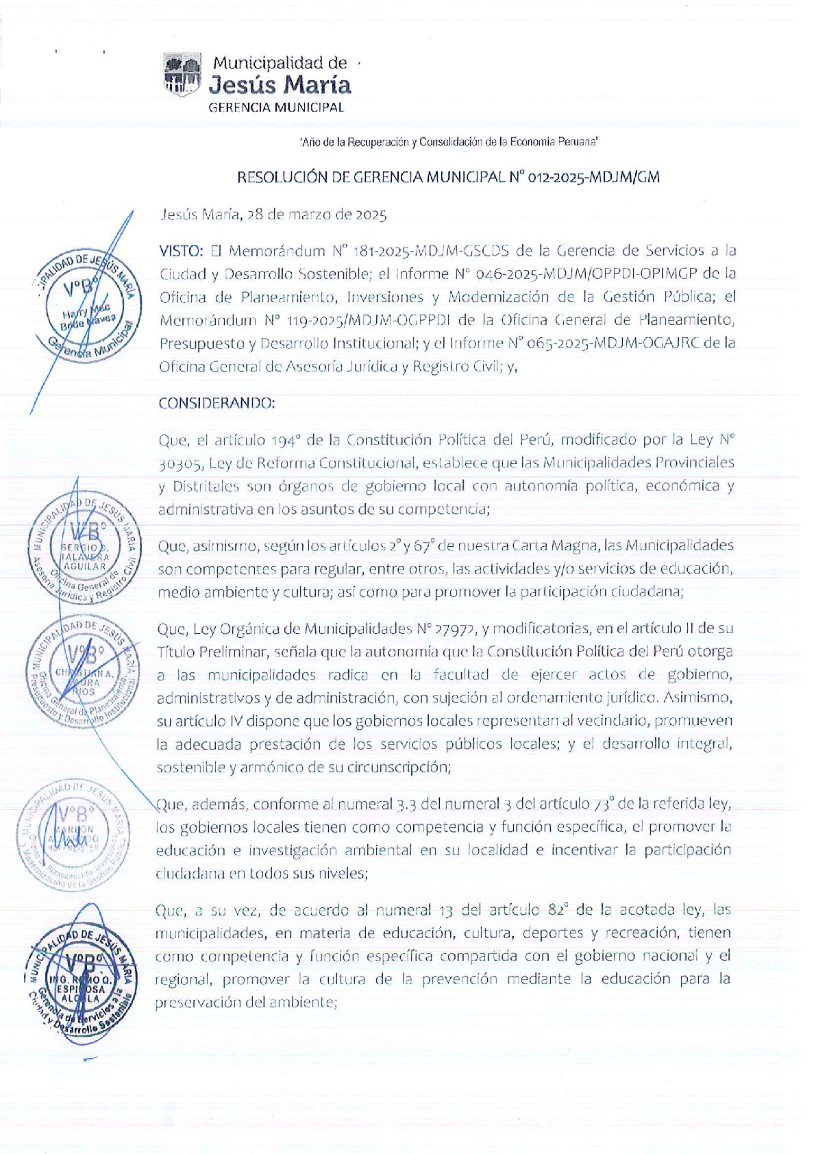 La presente Resolución de Gerencia Municipal aprueba el Plan de Trabajo 2025 del Programa Municipal de Educación, Cultura y Ciudadanía Ambiental de la Municipalidad Distrital de Jesús María (Lima Metropolitana), con la finalidad de definir las actividades de educación, cultura y ciudadanía ambiental que se desarrollaran en la localidad durante el presente año.