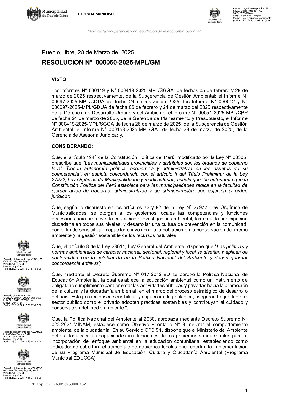 La presente Resolución de Gerencia Municipal aprueba el Plan de Trabajo 2025 del Programa Municipal de Educación, Cultura y Ciudadanía Ambiental de la Municipalidad Distrital de Pueblo Libre (Lima Metropolitana), con la finalidad de definir las actividades de educación, cultura y ciudadanía ambiental que se desarrollaran en la localidad durante el presente año.